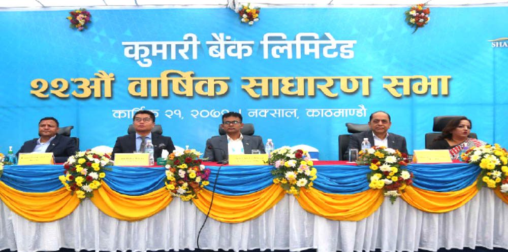 काठमाडौं । कुमारी बैंक लिमिटेडको बाइसौँ वार्षिक साधारणसभाले सेयरधनीलाई १२ दशमलव ५ प्रतिशत नगद लाभांश वितरण गर्ने प्रस्ताव पारित गरेको छ ।