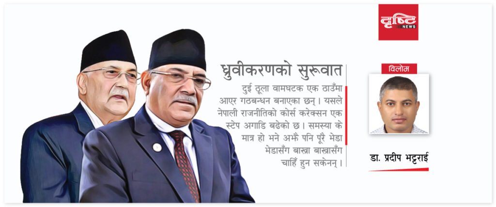भनाइ नै छ, राजनीति असंख्य सम्भावनाहरूको खेल हो । झट्ट हेर्दा असम्भवजस्तो देखिए पनि रात रहे अग्राख पलाउने देशमा त्यस्तो नहोला भन्न सकिन्न । यदि त्यस्तो भयो भने वामपन्थी ध्रुवीकरण एक स्टेप अगाडि पुग्थ्यो । यो क्रियाका लागि कांग्रेस नेतृत्व दक्षिणपन्थी गठबन्धन बनाएर प्रतिक्रिया दिन बाध्य हुन्थ्यो । फलतः देश वैचारिक धरातलमा दुई ध्रुवीय गठबन्धनमा अगाडि बढ्न सक्थ्यो । वास्तवमा नेपाल र नेपालीको सर्वोत्तम हितका लागि वैचारिक धरातलमा दुईदलीय राजनीतिक ध्रुवीकरणको विकल्प छैन ।