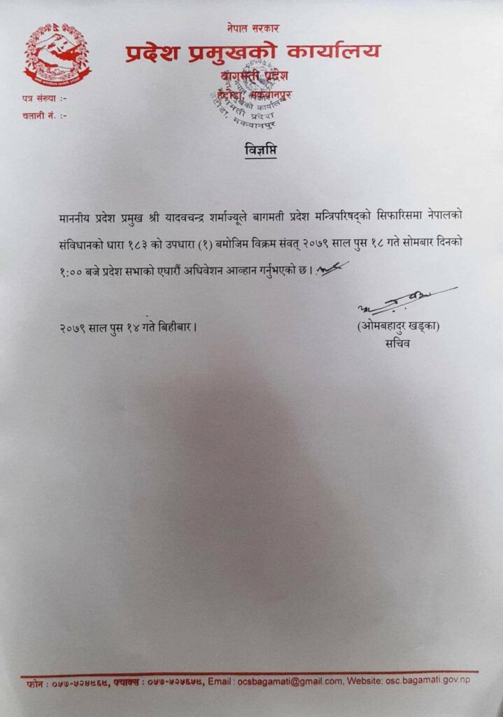हेटौंडा । बागमती प्रदेशसभा बैठक यही पुस १८ गते सोमबार दिउँसो १ बजे बस्नेगरी आह्वान गरिएको छ । बागमती प्रदेश प्रमुखको कार्यालयले सूचना बिहीबार सूचना गरी गर्दै मंसिर ४ गते सम्पन्न निर्वाचनबाट गठित प्रदेशसभाको पहिलो बैठक सोमबारका लागि तय भएको जानकारी गराएको हो ।