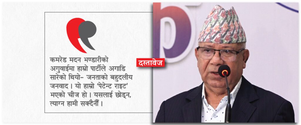 हामीले पार्टीलाई भिन्न ढंगले अगाडि बढाउन चाहिरहेका छौँ । जिम्मेवार पार्टीको रुपमा, जनताको सेवक पार्टीको रुपमा, देशभक्त पार्टीको रुपमा, क्रान्तिकारी रुपान्तरण गर्ने पार्टीको रुपमा, जनतासँग नङ र मासुको सम्बन्ध भएको पार्टीको रुपमा अगाडि बढाउन चाहन्छौँ । जनताबाट टाढियौ भने जनताले तिमीलाई अस्वीकार गर्छन । जनताको माझमा जाऊ, जनताको विश्वास जित र जनतालाई चुन्ने जुन अधिकार छ, चुनिनका लागि पनि आवधिक निर्वाचनको प्रक्रियामा सामेल होऊ । यो विचार विश्व कम्युनिष्ट आन्दोलनमा कुन पार्टीले अगाडि सारेको थियो ? हामीले नै सारेका थियौँ, कमरेड मदन भण्डारीको अगुवाईमा हाम्रो पार्टीले अगाडि सारेको थियो–जनताको बहुदलीय जनवाद । यो हाम्रो पेटेन्ट राइट भएको चीज हो । यसलाई छोड्न, त्याग्न हामी सक्दैनौँ ।