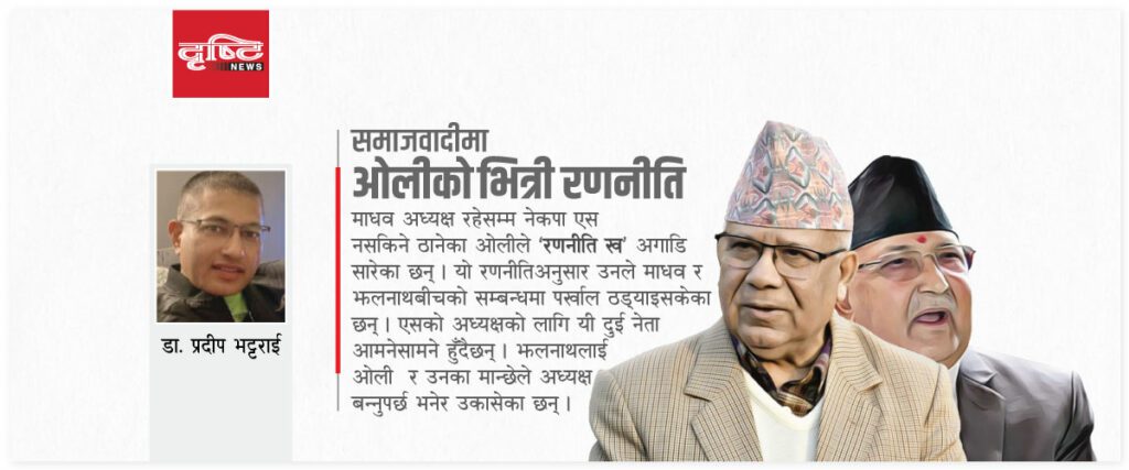 यसरी आफ्ना सारा चालहरू फत्ते गर्दै अगाडि बढेका ओलीको अर्जुन–दृष्टि यतिबेला नेकपा एसको महाधिवेशनमा अडिएको छ । माधव नेपाल अध्यक्ष हुन्जेल एस नसकिने ठानेका एस सक्न ‘रणनीति ख’ अगाडि सारिएको छ । यो रणनीतिअनुसार उनले नेपाल र खनालबीचको सम्बन्धमा पर्खाल ठड्याइसकेका छन् ।