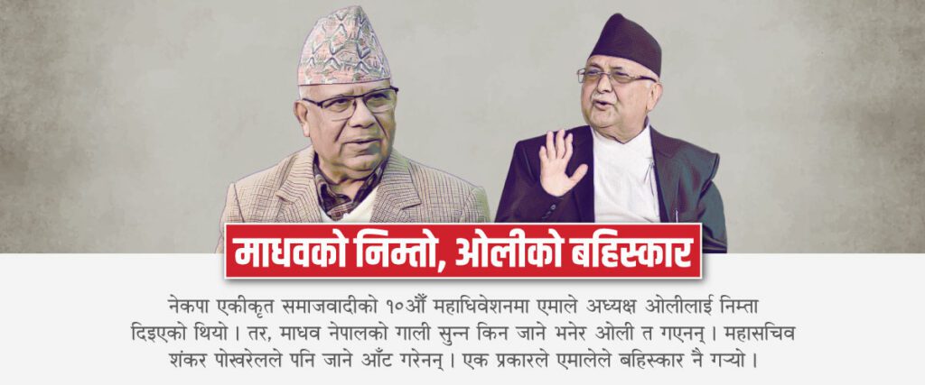 काठमाडौं । नेकपा (एमाले)का अध्यक्ष केपी शर्मा ओलीले प्रतिगामी कदम चालेपछि त्यसको विरुद्धमा उभिएका माधवकुमार नेपाल र झलनाथ खनालले विद्रोह गरेर स्थापना गरेको पार्टी नेकपा (एकीकृत समाजवादी) १०औँ राष्ट्रिय महाधिवेशनमा छ ।