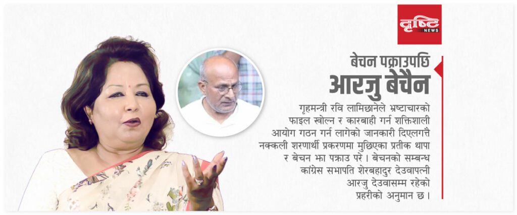 गृहमन्त्री रवि लामिछानेले भ्रष्टाचारको फाइल खोल्न र कारबाही गर्न शक्तिशाली आयोग गठन गर्न लागेको जानकारी दिएलगत्तै नक्कली शरणार्थी प्रकरणमा मुछिएका प्रतीक थापा र बेचन झा पक्राउ परे । बेचनको सम्बन्ध कांग्रेस सभापति शेरबहादुर देउवापत्नी आरजु देउवासम्म रहेको प्रहरीको अनुमान छ ।