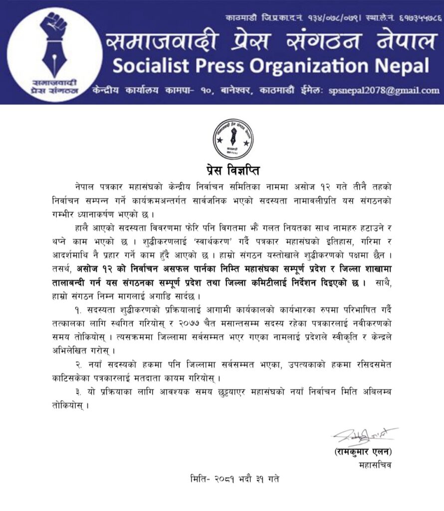 असोज १२ गते तीनै तहको निर्वाचन सम्पन्न गर्ने कार्यक्रमअन्तर्गत सार्वजनिक गरिएको सदस्यता नामावलीमा फेरि पनि विगतमा झैं गलत नियतका साथ नाम हटाउने र थप्ने काम भएको सो संगठनले जनाएको छ ।