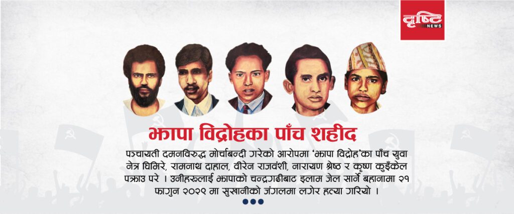 छिमेकी भारतमा भएको कम्युनिष्ट आन्दोलनबाट झापाली युवामा राजनीतिक चेत बढ्दै गयो । सामन्तवर्गको अत्याचारविरूद्ध युवा एक हुँदै गएका थिए । न्यायको पक्षमा आवाज उठाउनु पर्छ भन्ने युवा कम्युनिष्ट विचारधारा बोकर अगाडि बढे । र, एउटा विद्रोह जन्मियो । सोही विद्रोहलाई नेपालको राजनीतिक इतिहासमा ‘झापा विद्रोह’ भनिन्छ । आन्दोलनमा थिए, नेत्र घिमिरे, रामनाथ दाहाल, वीरेन राजवंशी, नारायण श्रेष्ठ र कृष्ण कुइँकेल ।