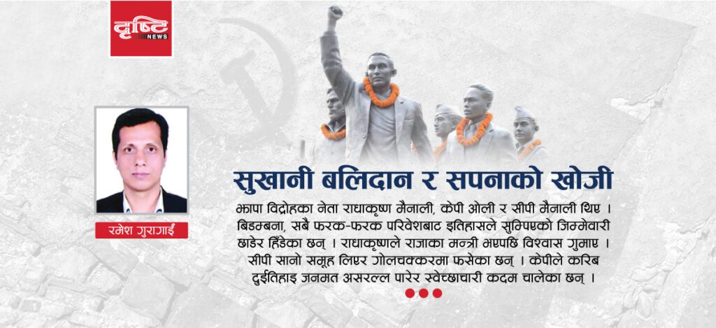 झापा विद्रोहका नेता राधाकृष्ण मैनाली, केपी ओली र सिपी मैनाली थिए । बिडम्बना, सबै फरक–फरक परिवेशबाट इतिहासले सुम्पिएको जिम्मेवारी छाडेर हिँडेका छन् । राधाकृष्णले राजाका मन्त्री भएपछि विश्वास गुमाए । सीपी सानो समूह लिएर गोलचक्करमा फसेका छन् । केपीले करिब दुईतिहाइ जनमत असरल्ल पारेर स्वेच्छाचारी कदम चालेका छन् ।