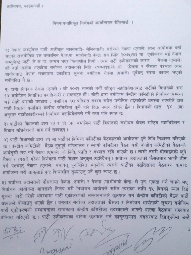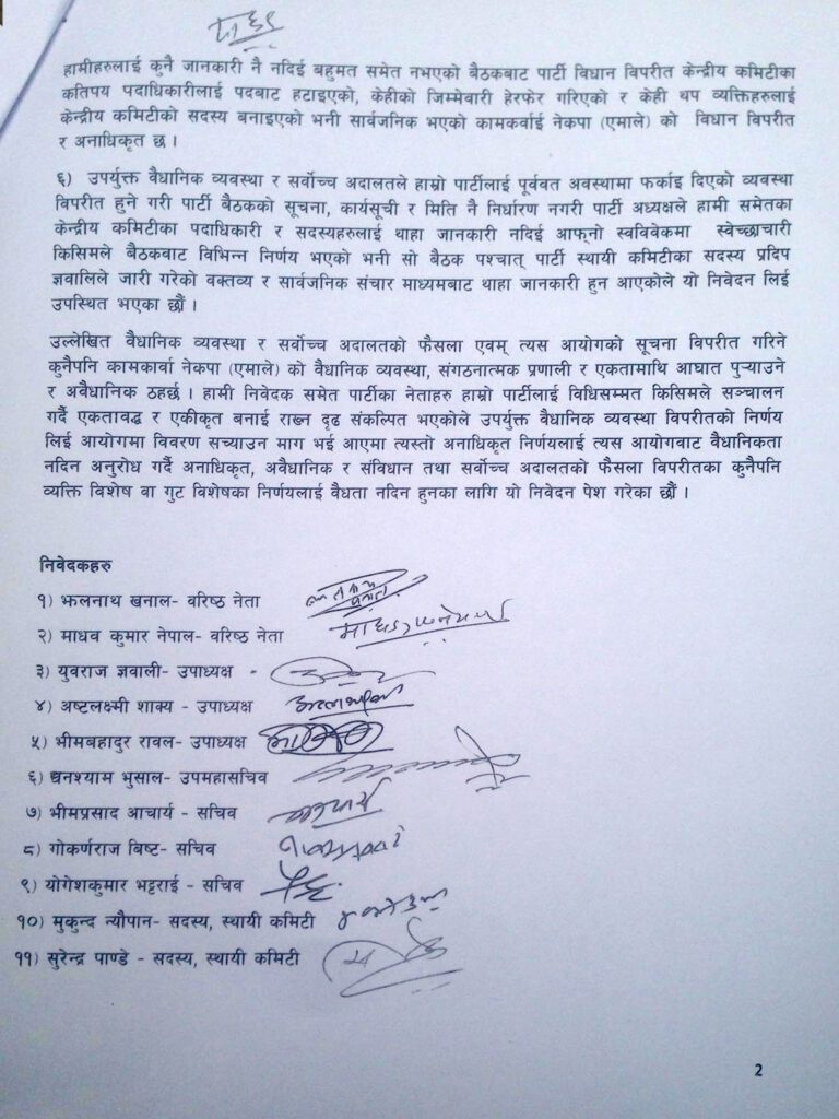 नेपाल समूहका ११ जना स्थायी समिति सदस्यको हस्ताक्षरसहित आयोगलाई प्रक्रिया रोक्न माग गरिएको हो । शुक्रबार अध्यक्ष पार्टीमा माओवादी केन्द्रबाट आएका २३ जना नेताहरुलाई केन्द्रीय सदस्यमा मनोनित गर्नुको साथै पार्टी पदाधिकारी खारेज गर्ने निर्णय गराएका थिए ।