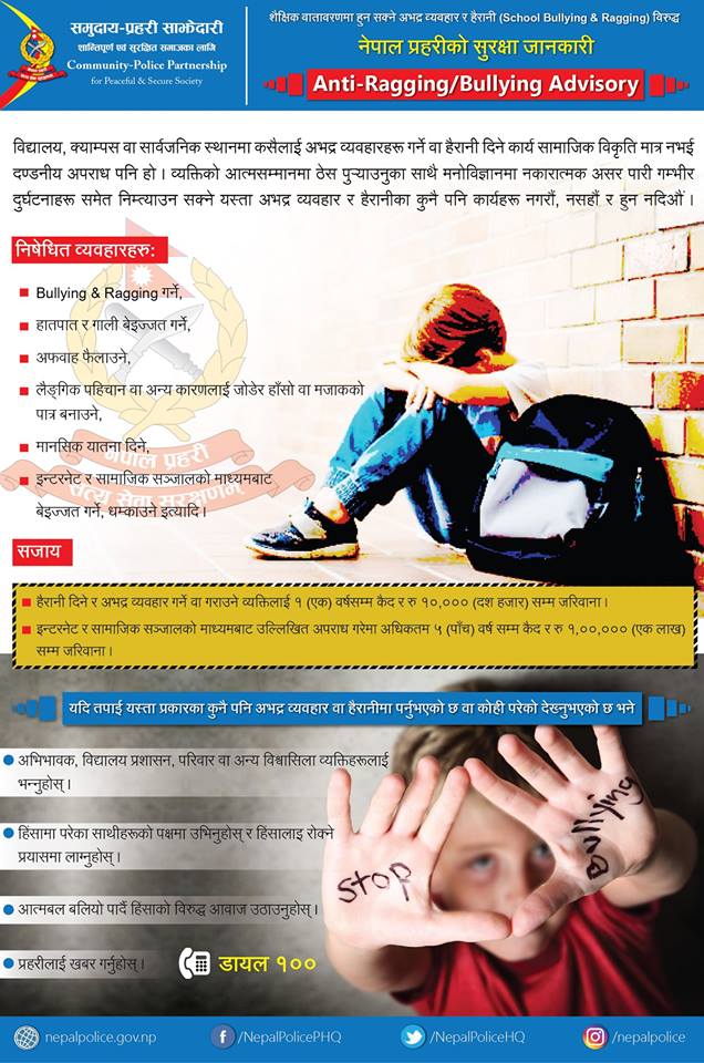 सफल हुँदै गएको प्रहरीको ‘समुदाय– प्रहरी साझेदारी’अभियान अन्र्तगत स्कुल कलेजमा हुने ¥यागिङ तथा बुलिङविरुद्ध अभियान सुरु भएको हो ।
