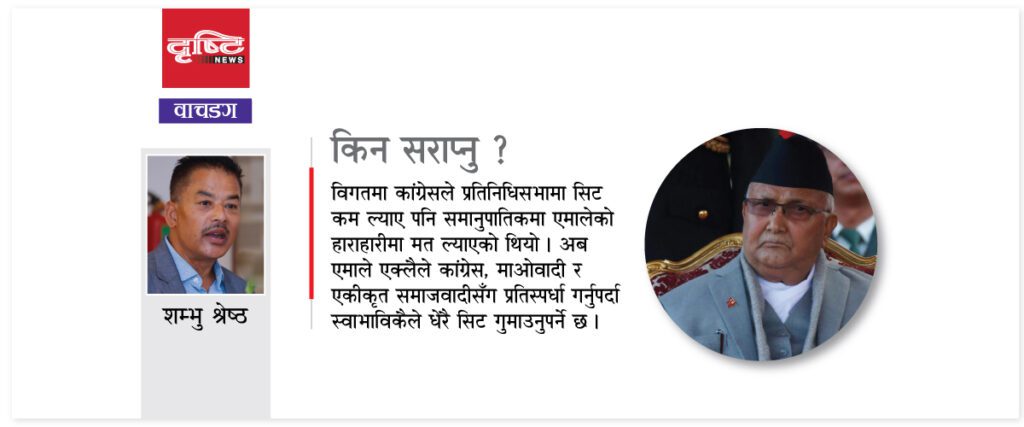 विगतमा कांग्रेसले प्रतिनिधिसभामा सिट कम ल्याए पनि समानुपातिकमा एमालेको हाराहारीमा मत ल्याएको थियो । अब एमाले एक्लैले कांग्रेस, माओवादी र एकीकृत समाजवादीसँग प्रतिस्पर्धा गर्नुपर्दा स्वाभाविकैले धेरै सिट गुमाउनुपर्ने छ ।