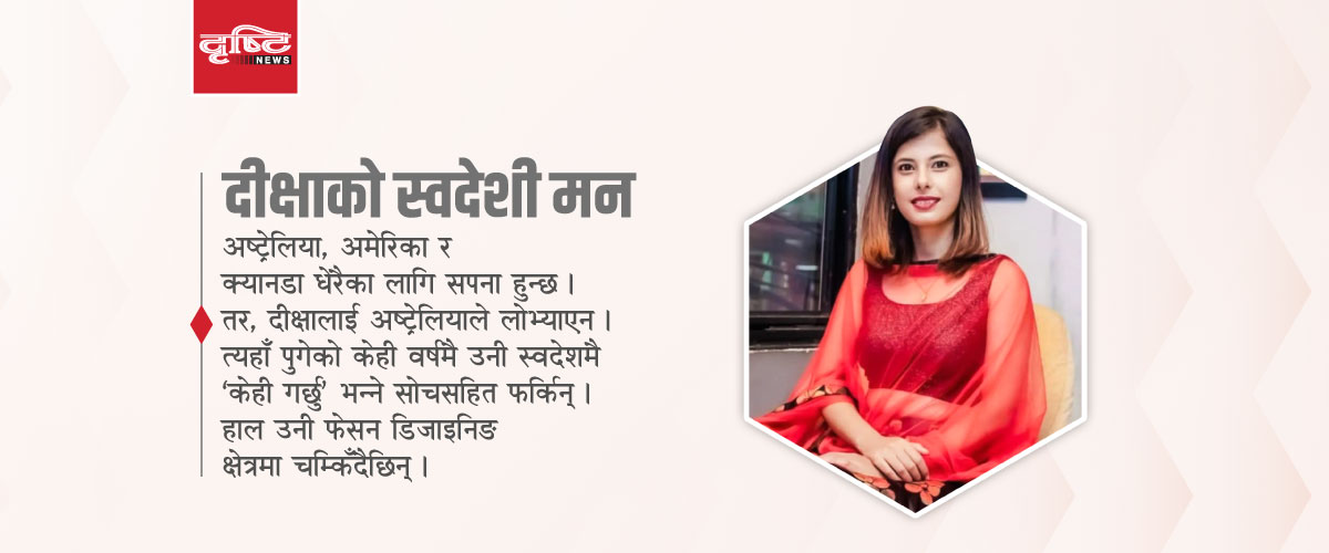दीक्षा ढकाल अष्ट्रेलिया पुगिन् । तर, दीक्षाको मन अष्ट्रेलियामा अडिन सकेन । अष्ट्रेलियामा उनको रामै्र कमाइ र दिनर्चा चल्दैथियो । तर, उनलाई लाग्यो, ‘आफ्नै देशमा केही गर्नुपर्छ ।’ त्यही सोच र उद्देश्य लिएर अष्ट्रेलियाको सान्दार दिनचर्या त्यागेर नेपाल फर्किए दीक्षा अहिले फेसन डिजाइनिङ क्षेत्रमा रमाइरहेकी छन् । ‘भिकुना’ नामक बुटिक सञ्चालन गर्दै आएकी दीक्षाले फेसन क्षेत्रबाट नाम र दाम कमाइरहेकी छन् । उनी भन्छिन्, ‘म फेसन क्षेत्रबाट सन्तुष्ट छ । यहीबाट मैले नेम र फेम पाएकी छु ।’ ‘बिजनेश’मा मास्टर डिग्री गरेकी फेसन डिजाइनर दीक्षा ढकालसँग रजिना पाण्डेको जम्काभेट :