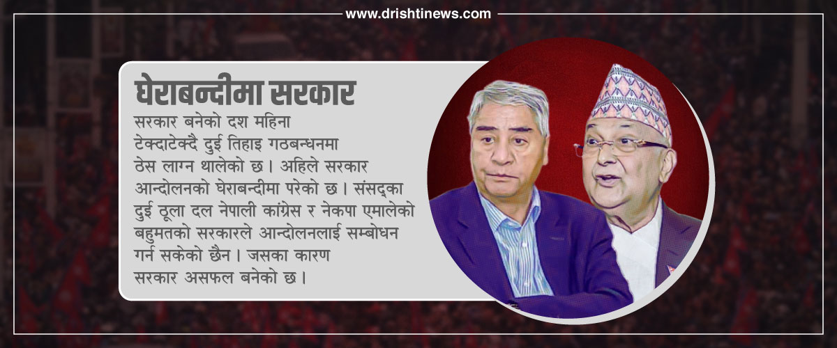 काठमाडौं । सरकार बनेको दश महिना टेक्दाटेक्दै दुई तिहाइमा गठबन्धनमा ठेस लाग्न थालेको छ । अहिले सरकार आन्दोलनको घेराबन्दीमा परेको छ । संसद्का दुई ठूला दल नेपाली कांग्रेस र नेकपा एमालेको बहुमतको सरकारले आन्दोलनलाई सम्बोधन गर्न सकेको छैन । जसका कारण सरकार असफल बनेको छ ।