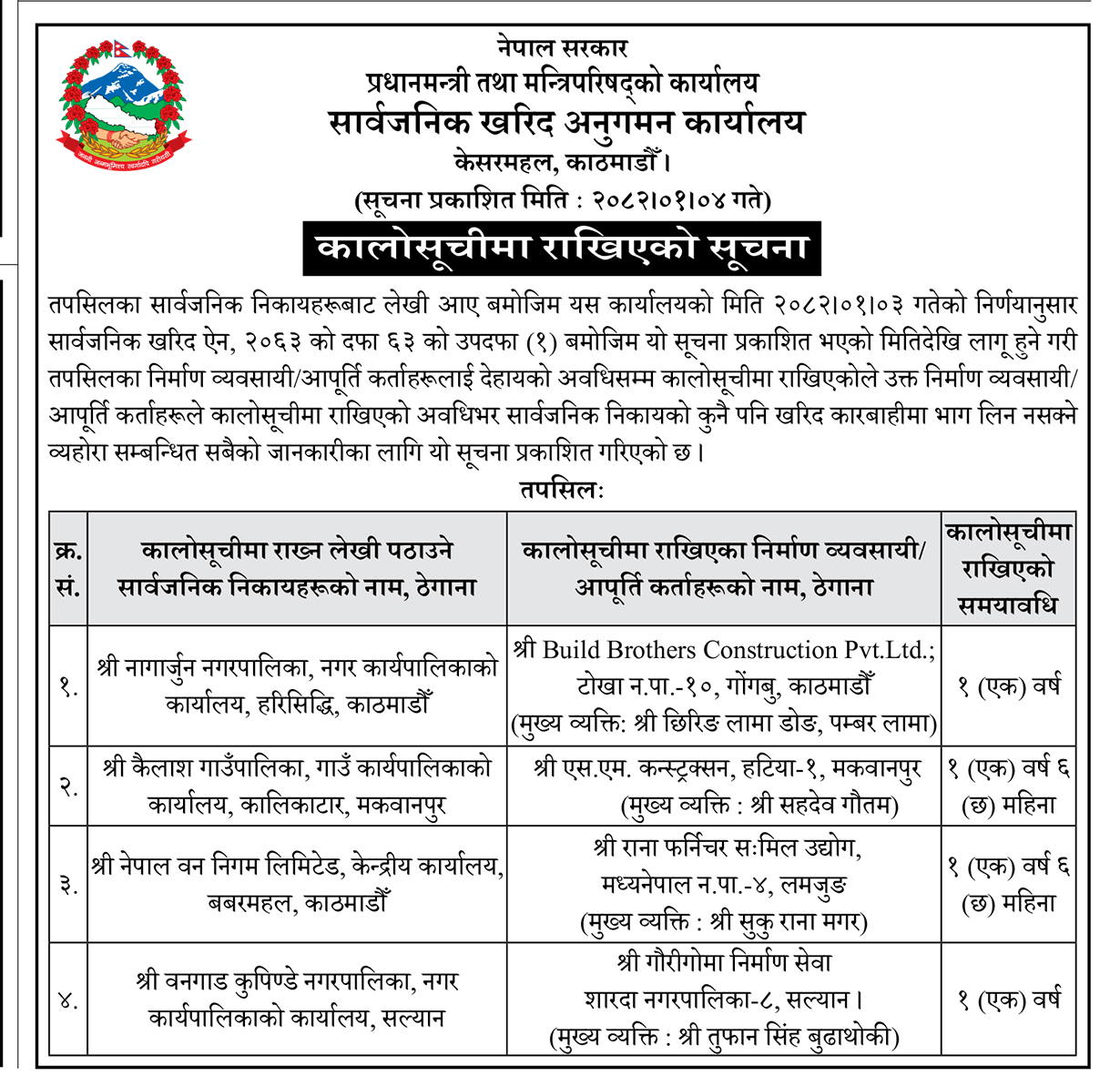 कालोसूचीमा पर्ने कम्पनीहरुमा छिरिङ लामा डोङ र पम्बर लामा मुख्य व्यक्ति भएको बिल्ड ब्रदर्श कन्सट्रक्सन प्रालि गोंगबु, सहदेव गौतम मुख्य व्यक्ति भएको एस.एम. कन्सट्रक्सन मकवानपुर, सुकु रानामगर मुख्य व्यक्ति भएको राना फर्निचर सःमलि उद्योग मध्यनेपाल लमजुङ र तुफान सिंह बुढाथोकी मुख्य व्यक्ति भएको शारदा नगरपालिका सल्यानको गौरीगोमा निर्माण सेवा छन् ।