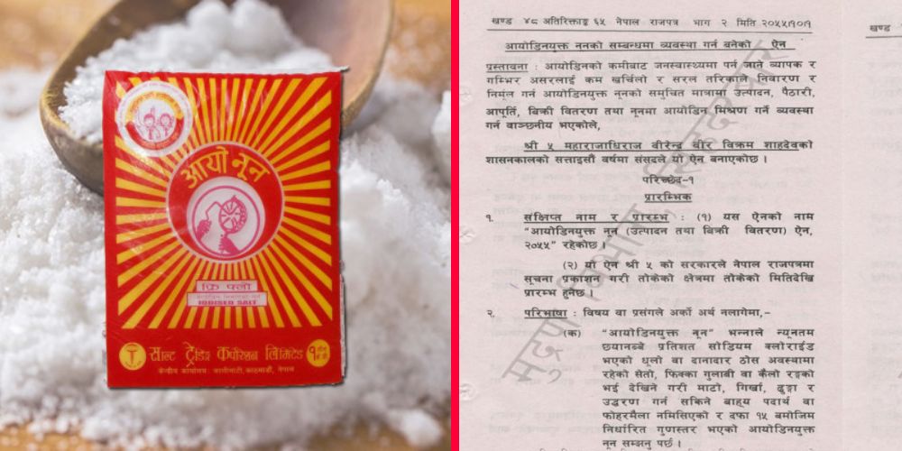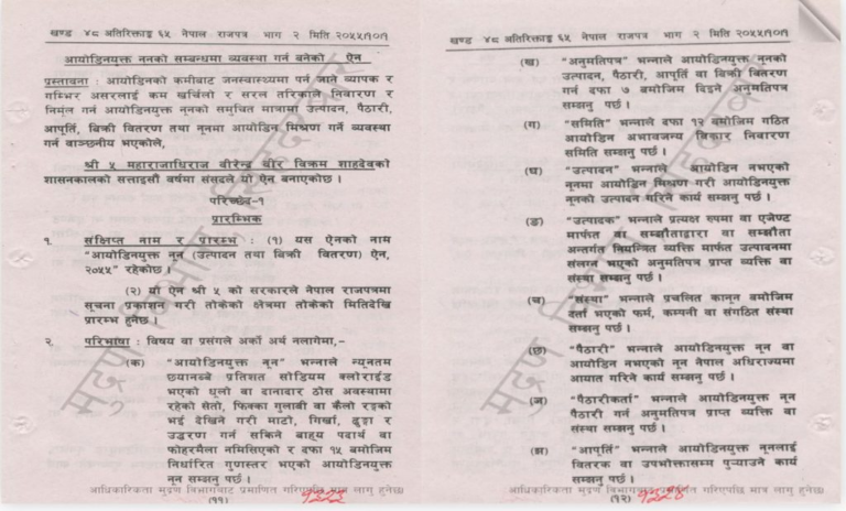 काठमाडौं । आयोडिनयुक्त नुन सम्बन्धी ऐन जारी भएको २७ वर्षपछि कार्यान्वयनमा आउने भएको छ । आयोडिनयुक्त नुन उत्पादन तथा बिक्री वितरण ऐन २०५५ कार्यान्वयनका लागि बाटो खुलेको छ ।