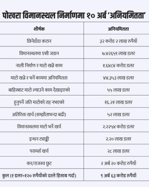 काठमाडौं । संसद्को सार्वजनिक लेखा समितिको उपसमितिले पोखरा अन्तर्राष्ट्रिय विमानस्थल निर्माणमा नीतिगत आवरणमा व्यापक अनियमितता भएको निष्कर्ष निकालेको छ । सांसद राजेन्द्र लिङ्देनको नेतृत्वमा गठित उपसमितिले सम्भाव्यता अध्ययनदेखि निर्माण सम्पन्नसम्मको प्रक्रियामा संलग्न पदाधिकारी, कर्मचारी र सरोकारवालामाथि छानबिन गर्न अख्तियार दुरुपयोग अनुसन्धान आयोगलाई निर्देशन दिन सुझाव दिएको हो ।