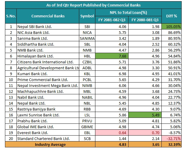राष्ट्र बैङ्कले तोकेको ५ प्रतिशतको खराब कर्जा सीमा नाघ्ने बैङ्कहरूको सङ्ख्या ९ पुगेको छ । हिमालयन बैङ्कले सिभिल बैङ्कलाई गाभेपछि सबैभन्दा बढी ७.६८ प्रतिशत खराब कर्जा देखाएको छ । त्यसपछिका स्थानमा कुमारी बैङ्क (६.९८नेपाल एसबीआई बैङ्कको खराब कर्जा १0५.0५% ले वृद्धि भई ४.०६ %पुगेको छ ।) र नेपाल इन्भेष्टमेन्ट मेगा बैङ्क (६.०६नेपाल एसबीआई बैङ्कको खराब कर्जा १.५५% ले वृद्धि भई ४.०६ % )पुगेको छ ।