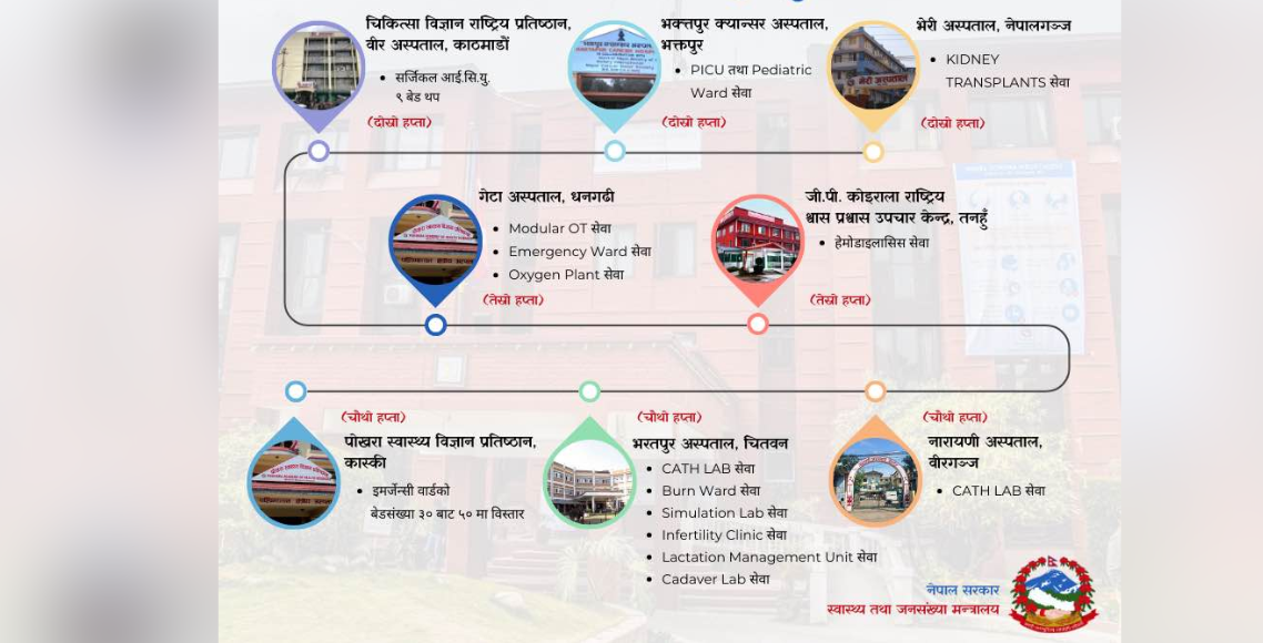 यसैगरी, पोखरा स्वास्थ्य विज्ञान प्रतिष्ठानले इमर्जेन्सी वार्डमा २० शैय्या वैशाख अन्त्यसम्ममा थप गर्नेछ । यसैगरी नारायणी अस्पताल वीरगञ्जले वैशाख अन्त्यसम्ममा क्याथ ल्याब आरम्भ गर्नेछ भने जीपी कोइराला राष्ट्रिय श्वासप्रश्वास केन्द्र तनहुँले हेमोडायलासिस सेवा वैशाख तेश्रो साता औपचारिक सञ्चालनमा ल्याउनेछ ।
