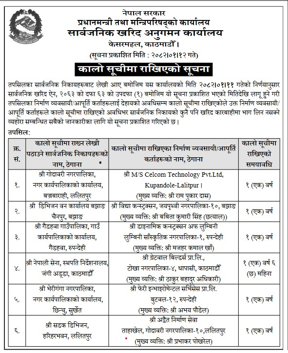 सार्वजनिक खरिद अनुगमन कार्यालयले सूचना जारी गर्दै विभिन्न निकायबाट कालो सूचीमा राख्नको लागि लेखि पठाएअनुसार ६ वटा निर्माण कम्पनीलाई काली सूचीमा राखिएको जाानकारी दिएको हो ।