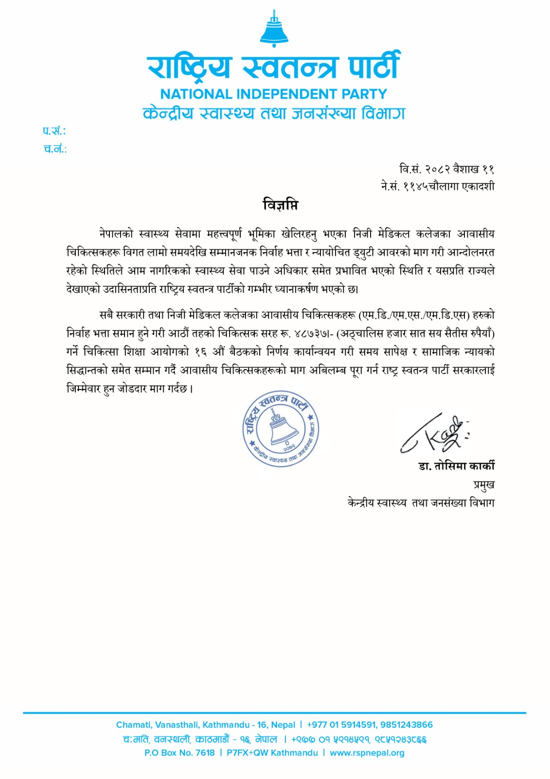 रास्वपाकी केन्द्रीय स्वास्थ्य तथा जनसंख्या विभाग प्रमुख डा. तोसिमा कार्कीले विज्ञप्ति जारी गरेर आवासीय चिकित्सकका माग पुरा गर्न सरकारको ध्यानाकर्षण गराएकी हुन्।