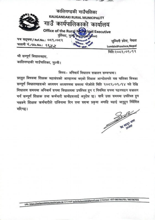 काठमाडौं । गुल्मीको कालिगण्डकी गाउँपालिकाले १४ गतेदेखि विद्यालय नआउने शिक्षकहरूलाई राजीनामा दिन भनेको छ । आन्दोलनरत शिक्षकहरूलाई विद्यालय फर्किन आग्रह गर्दै अटेर गरे राजीनामा दिन गाउँपालिकाले निर्देशन दिएको हो ।