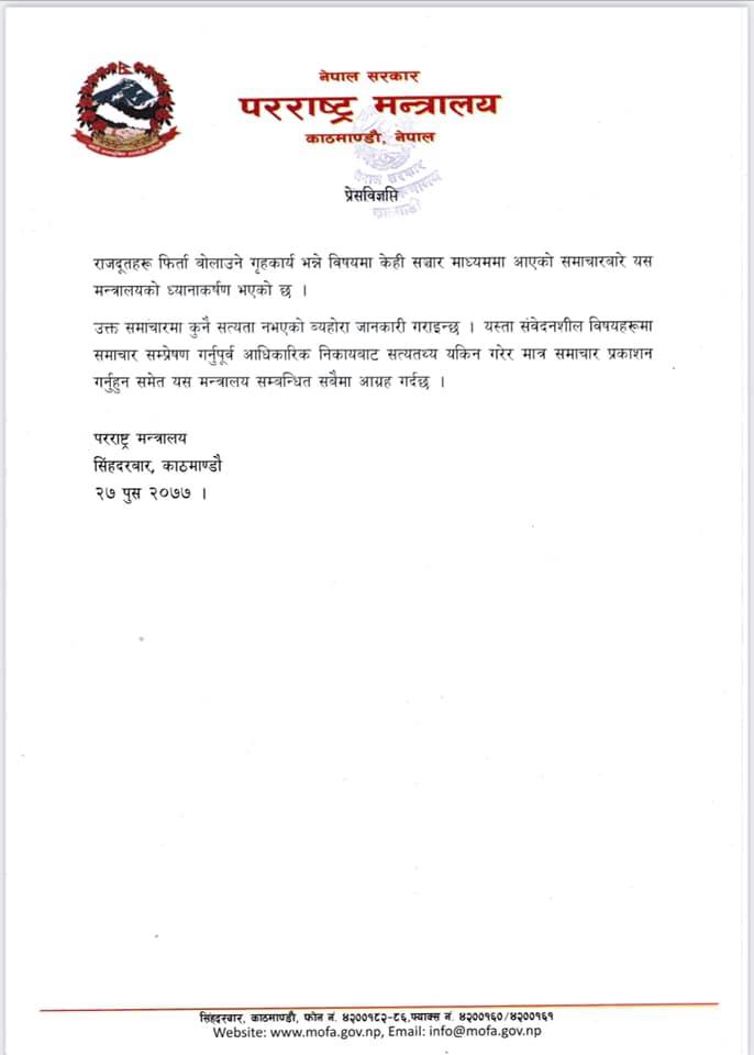 नेकपा विभाजनपछि प्रचण्ड–माधव नेपाल निकट राजदूतहरुलाई फिर्ता बोलाउने तयारी भइरहेको समाचार सार्वजनिक भएको थियो । मन्त्रालयले बिज्ञप्ती निकालेर नै त्यसको खण्डन गरेको छ । जसले राजदूतहरुलाई राहत भएको छ ।