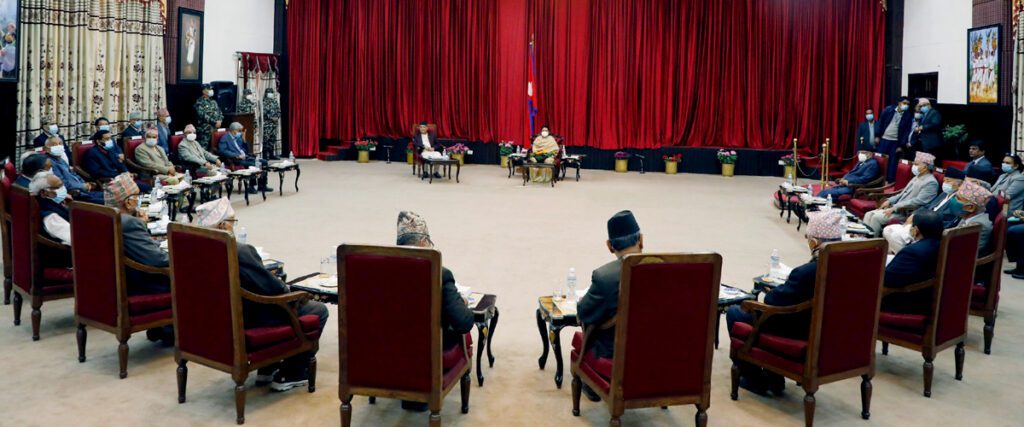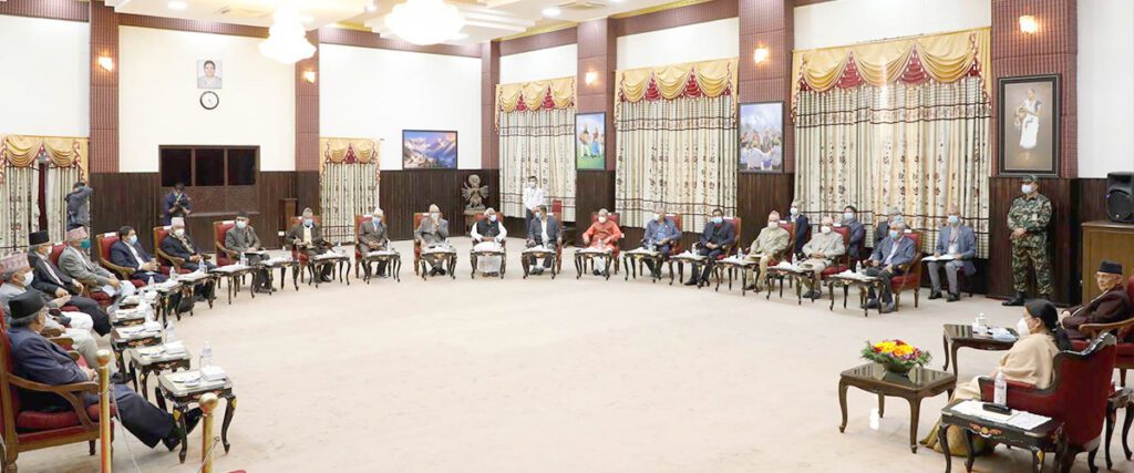 काठमाडौं । मंगलबार अपराह्न चार बजे राष्ट्रपति विद्यादेवी भण्डारीको आह्वानमा सर्वदलीय बैठक बस्यो । सोमबार नै राति सबै दललाई बैठक आह्वान गरिएको सूचना पुगेसँगै मंगलबार बैठक बसेको थियो ।