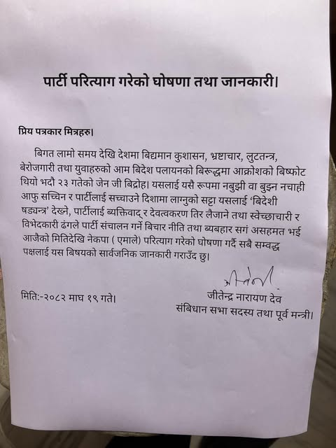 काठमाडौं । संविधान सभा सदस्य एवम् पूर्वमन्त्री जितेन्द्र देवले नेकपा एमाले पार्टी परित्याग गरेका छन् । उनले आज विज्ञप्ति जारी गर्दै एमाले परित्याग गरेको जानकारी दिएका हुन् ।