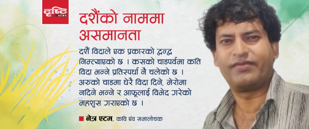 काठमाडौं । पहिला दशैं आउनसाथ गाउँ जान हतारिन्थे कवि एंव समालोचक नेत्र एटम । दशैं गाउँ जानकै लागि आएको एउटा उत्सवजस्तो लाग्थ्यो । दशैंलाई गाउँ जाने चाडको रुपमा लिन्थे । दशैं बिदा कहिले हुन्छ भनेर पर्खन गाह्रो हुन्थ्यो उनलाई । कलेज बिदा हुन एकहप्ता अघि नै कति बेला गाउँ जाऊँ भन्ने लाग्थ्यो ।