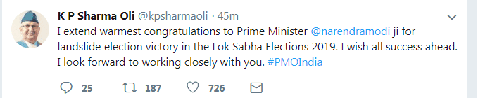भारतीय प्रधानमन्त्री नरेन्द्र मोदीलाई प्रधानमन्त्री केपी शर्मा ओलीले बधाई दिएका छन् । भारतीय लोकसभा निर्वाचनको मोदी पार्टी भाजपा नेतृत्वको गठबन्धनले जित्ने निश्चित देखिएपछि प्रधानमन्त्री ओलीले बिहीबार दिउँसो ट्वीटमार्फत बधाई दिएका हुन् । ‘सान्दार जितका लागि हार्दिक बधाई’ दिँदै आगामी दिनमा सहकार्यका लागि समेत आफू आशावादी रहेको उल्लेख गरेका छन् ।