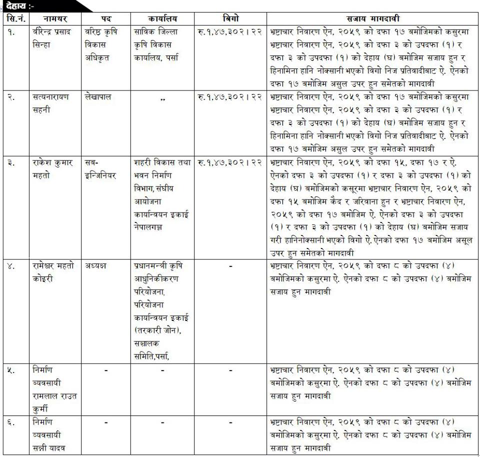 अनुसन्धान हुँदा साविक जिल्ला कृषि विकास कार्यालय पर्साका वरिष्ठ कृषि विकास अधिकृत वीरेन्द्र प्रसाद सिन्हा र लेखापाल सत्यनारायण सहनीले मिलेमतोमा आ.व २०७४÷०७५ सालको बजेटबाट कार्यालय प्राङ्गणमा निर्माण तथा मर्मत कार्यहरु गर्दा लागत अनुमान टुक्रयाई निर्माण व्यवसायीसँगको मिलेमतोमा प्रतिस्पर्धालाई सिमित हुने गरी टुक्राटुक्रा पारी कोटेशनबाट काम गराई सार्वजनिक खरिद ऐन नियमावलीको विपरीत हुने गरी कार्य गरेको थिए । सो कार्य सम्पन्न गर्नको लागि न्यून गुणस्तरको सामान प्रयोग गरी रंगरोगन गरेको साथै प्राविधिकबाट चेक भएको गराई ठेक्का सम्बन्धी बिल, कार्यसम्पन्न प्रतिवेदन र नापी किताब बदनियतपूर्वक नक्कली, झुठ्ठा बनाई सोही आधारमा भुक्तानी दिएको,शहरी विकास तथा भवन निर्माण विभाग, संघीय आयोजना कार्यान्वयन ईकाई नेपालगञ्जमा सब(ईन्जिनियरको पदमा कार्यरत रहेका राकेश कुमार महतोले आफू कार्यसम्पन्न प्रतिवेदनसमेत दिनुपर्ने कर्तव्य भएको व्यक्ति नहुँदा नहुँदै पनि डिभिजन कार्यालय पर्साको नक्कली किर्ते लेटर हेडमा नक्कली किर्ते छाप बनाएका थिए । नपाएको ओहदाको पद (इन्जिनियर) भएको भनी दस्तखत गरी “इन्जिनियर“ पद ओहदाको नक्कली छापसमेत बनाइ किर्ते कार्यसम्पन्न प्रतिवेदन बनाएको, प्रधानमन्त्री कृषि आधुनिकीकरण परियोजना, परियोजना कार्यान्वयन इकाई (तरकारी जोन) पर्साका सञ्चालक समितिका अध्यक्ष रामेश्वर महतो कोइरीले प्रतिफलमा आधारित प्रोत्साहन अनुदानको रकम वितरण गर्दा वदनियतपूर्वक भर्पाईमा अंक थप्ने, सच्याउने एवं कम रकम वितरण गरी बढी रकमको भर्पाई बनाई अधिकारको दुरुपयोग समेत गरी सरकारी रकम हिनामिना गरेको, नितु कन्सट्रक्सनका प्रोपाइटर निर्माण व्यवसायी रामलाल राउत कुर्मी र निर्माण व्यवसायी सन्नी यादवले लागत अनुमान, कार्यसम्पन्न प्रतिवेदन लगायतका कागजातमा डिभिजन कार्यालय पर्साको हेडर र छाप प्रयोग भएको नक्कली कागजातहरू तयार गर्ने र सो का आधारमा भुक्तानी लिने कार्यमा कार्यालय प्रमुख वीरेन्द्र प्रसाद सिन्हासमेतसँग मिलेमतो रहेको आयोगले जनाएको छ । उनीहरुविरुद्ध बिहीबार बिशेष अदालतमा मुद्दा दायर भएको छ ।