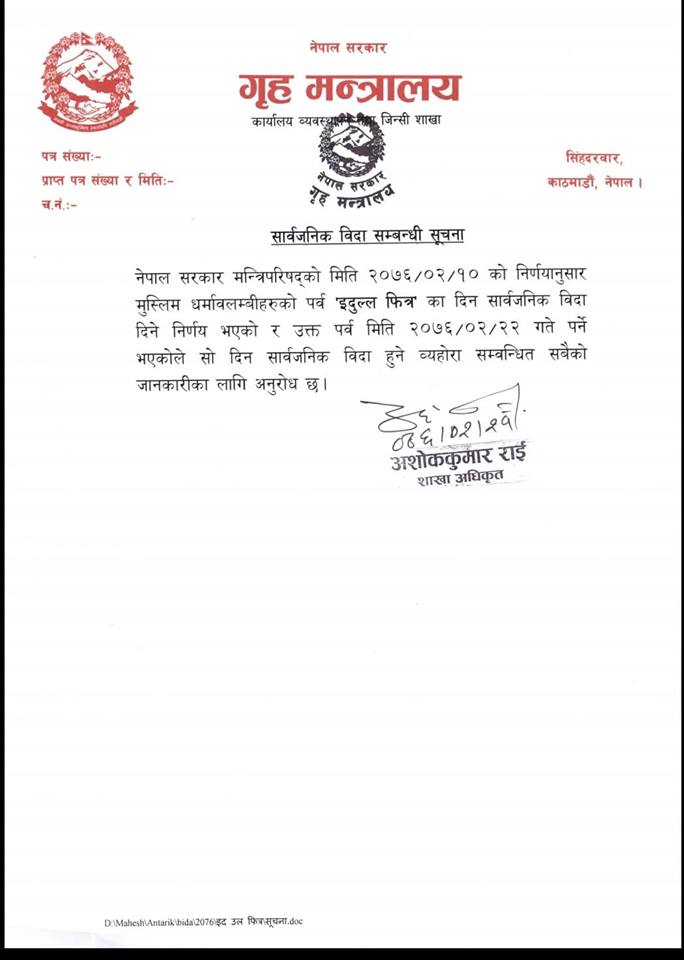 गृहको विज्ञप्तिमा मन्त्रिपरिषदको निर्णयअनुसार सो विदा दिइएको उल्लेख छ। ‘जेठ १० को मन्त्रिपरिषद बैठकको निर्णयअनुसार मुस्लिम धर्मावलम्बीको पर्व ‘इद उल फित्र’का लागि सार्वजनिक विदा दिइएको जानकारीको लागि अनुरोध छ,’ गृहको विज्ञप्तिमा उल्लेख छ। विदाअनुसार बुधबार सबै सरकारी कामकाज बन्द हुनेछन्।