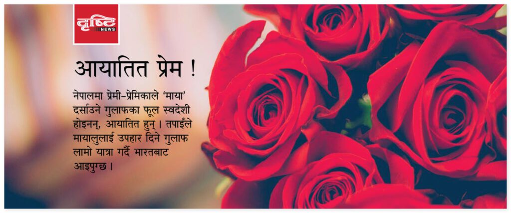 तर, नेपालमा प्रेमी–प्रेमिकाले ‘माया’ दर्साउने ती गुलाफका फूल भने स्वदेशी होइनन्, आयातित हुन् । तपाईंले मायालुलाई उपहार दिने गुलाफ लामो यात्रा गर्दै भारतबाट आइपुग्छन् । त्यही गुलाफ प्रेमको रुपमा हामी आफूलाई मनपर्ने व्यक्तिलाई दिन्छौँ ।