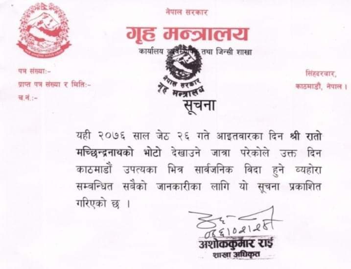 गृह मन्त्रालयले विज्ञप्ति निकालेर आइतबार रातो मछिन्द्रनाथको भोटो देखाउने जात्रा परेकाले सार्वजनिक विदा हुने जानकारी गराएको हो।