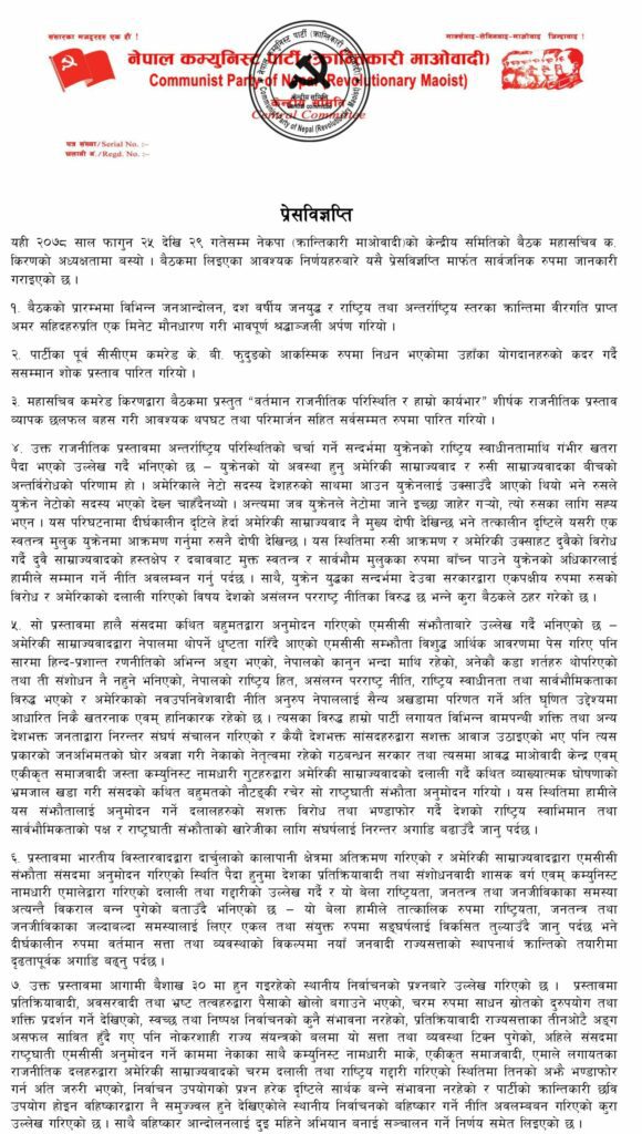 बैठकमा महासचिव वैद्यले ‘वर्तमान राजनीतिक परिस्थिति र हाम्रो कार्यभार’ शीर्षकमा राजनीतिक प्रस्ताव पेश गरेका थिए । सो प्रस्तावमा स्थानीय निर्वाचन बहिष्कार गर्ने नीति अवलम्बन गरिएकोमा बैठकले पारित गरेको हो ।