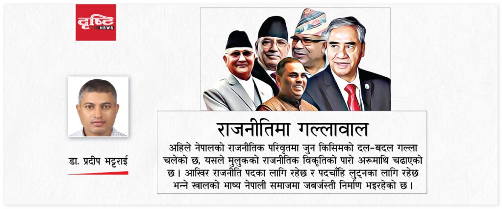 अहिले नेपालको राजनीतिक परिवृत्तमा जुन किसिमको दल–बदल गल्ला चलेको छ, यसले मुलुकको राजनीतिक विकृतिको पारोलाई अरू उकासेको छ । आखिर राजनीति पदका लागि रहेछ र पदचाँहि लुट्नका लागि रहेछ भन्ने खालको भाष्य नेपाली समाजमा जबर्जस्ती निर्माण भइरहेको छ । र, यो भाष्य निर्माण गर्न राजनीतिको मुहान सङ्लो पार्नुपर्नेहरू नै लागिरहेका छन् ।