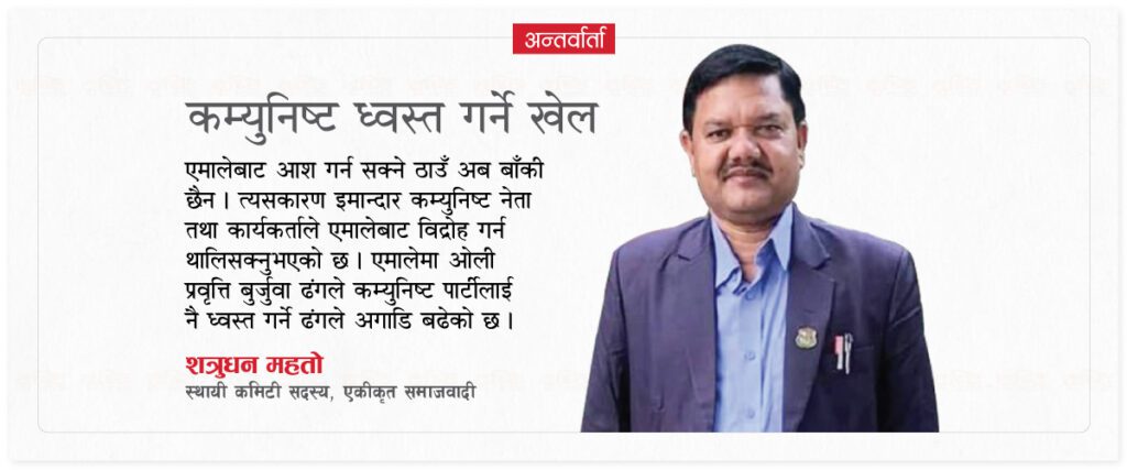 व्यवस्थामाथि नै धावा बोल्ने, संविधान कार्यान्वयन गर्ने ठाउँमा बसेर उल्टै संविधान मिच्दै हिड्ने, सार्वभौम संसदलाई गैरसंवैधानिक रुपमा पटक–पटक विघटन गर्ने ओली प्रतिगामी नै हुन् । एमालेमा ओली प्रवृत्ति बुर्जुवा ढंगले कम्युनिष्ट पार्टीलाई नै ध्वस्त गर्ने ढंगले अगाडि बढेको छ । ओली प्रवत्ति नसिद्धिएसम्म कम्युनिष्टहरू राम्रो ढंगले अगाडि जान सक्दैनन् । त्यसकारण बुर्जुवा ढंगले अगाडि बढेको एमालेलाई सिध्याउनुपर्छ । अनि मात्रै देशमा कम्युनिष्ट शक्ति बलियो हुन्छ ।