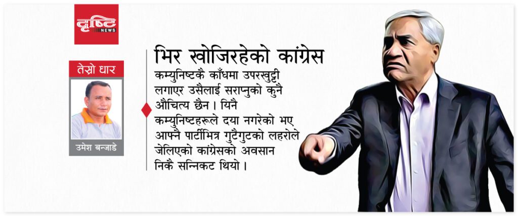 त्यसैले कम्युनिष्टकै काँधमा उपरखुट्टी लगाएर उसैलाई सराप्नुको कुनै औचित्य छैन । यिनै कम्युनिष्टहरुले दया नगरेको भए आफ्नै पार्टीभित्र गुटैगुटको लहरोले जेलिएको कांग्रेसको अवसान निकै सन्निकट थियो ।