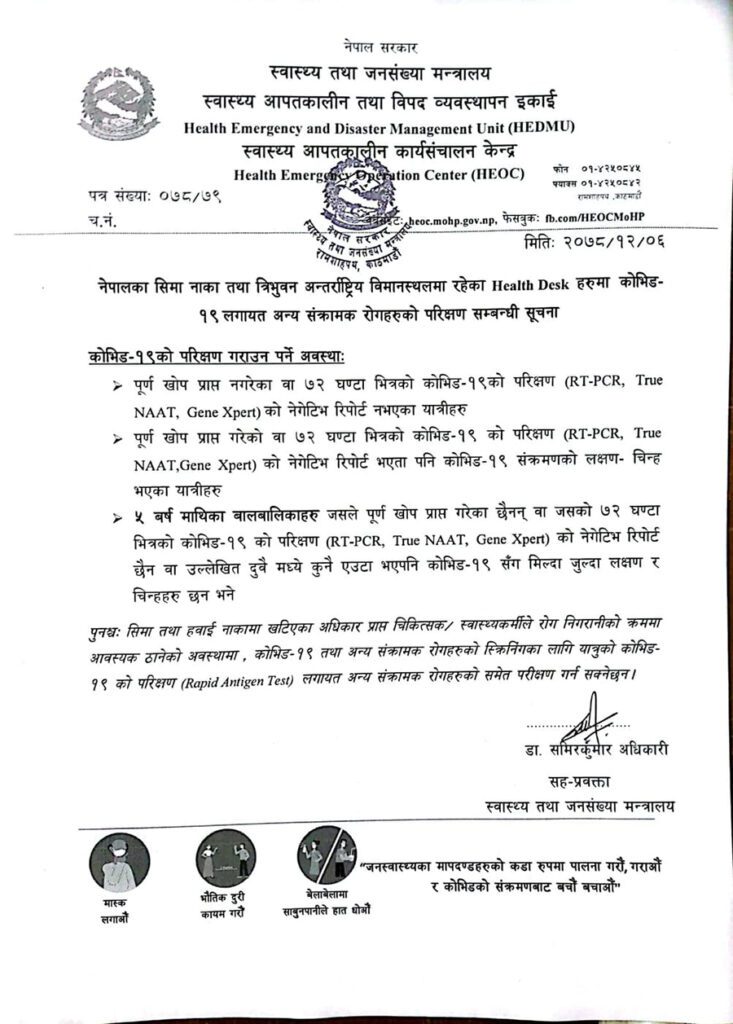 स्वास्थ्य तथा जनसंख्या मन्त्रालयका सहप्रवक्ता डा. समिरकुमार अधिकारीद्वारा जारी विज्ञप्तिका अनुसार पूर्ण खोप प्राप्त नगरेका वा ७२ घन्टाको पीसीआर रिपोर्ट नेगेटिभ नभएका, पूर्ण खोप वा पीसीआर रिपोर्ट नेगेटिभ भएपनि कोभिड–१९ सँग मिल्दोजुल्दो लक्षण देखिएका व्यक्तिले नाकामा कोभिड–१९ परीक्षण गराउनुपर्ने छ ।