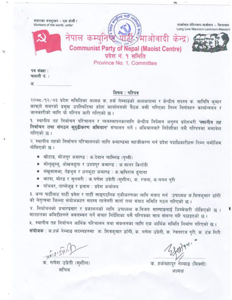 माओवादी केन्द्रको प्रदेश १ समितिले आन्तरिक परिपत्र जारी गर्दै प्रत्येक पालिका र वडालाई चैत २० गतेभित्र मत सर्वेक्षण गरी त्यसको विवरण प्रदेश कार्यालयमा पठाउन निर्देशन दिएको छ ।