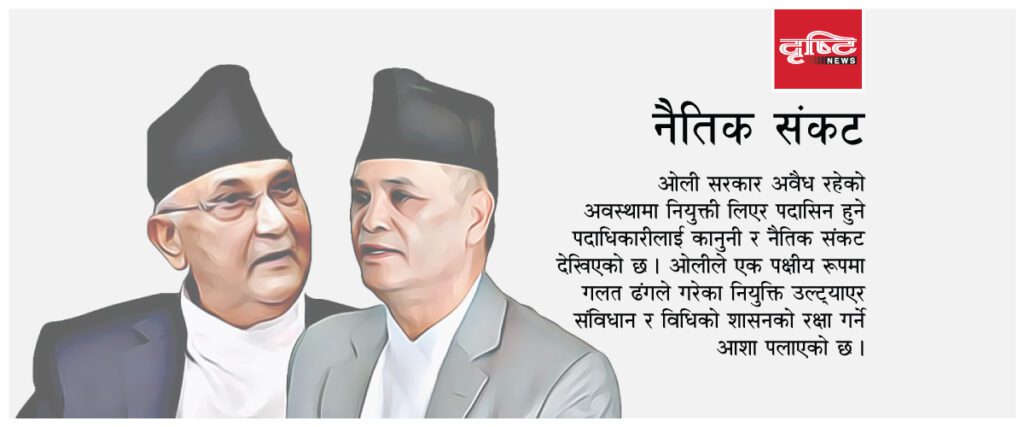 ओली सरकार नै अवैध रहेको अवस्थामा सोही सरकारको नियुक्ती लिएर पदासिन हुने पदाधिकारीलाई कानुनी र नैतिक संकट देखिएको छ । ओलीको ‘कब्जा’ रणनीति अन्तर्गत संवैधानिक निकाय, राजदूत, अर्धन्यायिक निकाय, समिति, संस्थान, प्रशासन सवैतिर आसेपासेलाई खल्तीबाट नियुक्ति गरेका थिए ।