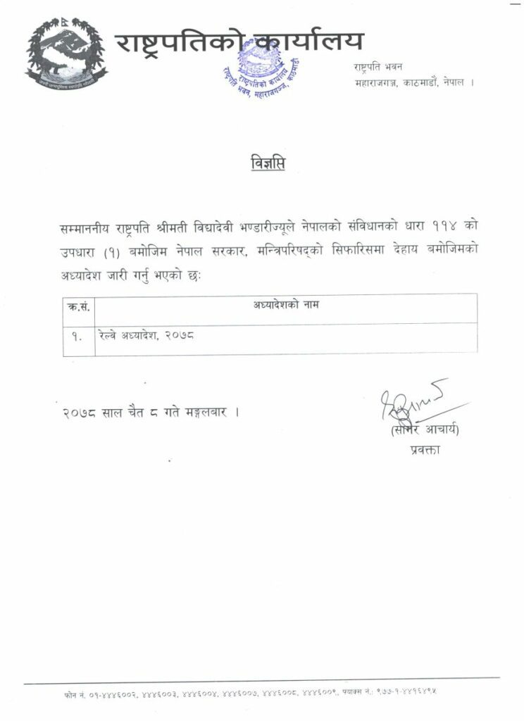 मंगलबार साँझ संविधानको धारा ११४ को उपधारा (१) बमोजिम राष्ट्रपति भण्डारी रेल्वे अध्यादेश, २०७८ जारी गरेको शितल निवासले विज्ञप्तिमार्फत जानकारी दिएको छ ।