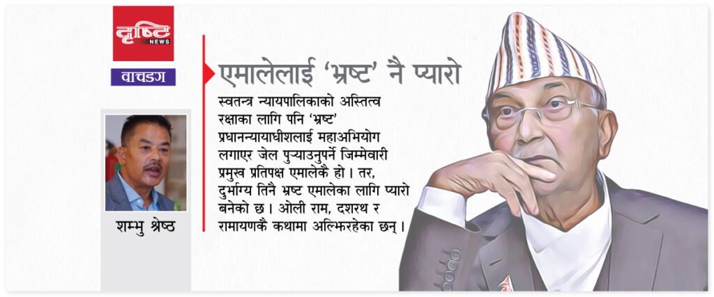 स्वतन्त्र न्यायपालिकाको अस्तित्व रक्षाका लागि पनि ‘भ्रष्ट’ प्रधानन्यायाधीशलाई महाअभियोग लगाएर जेल पुर्याउनुपर्ने जिम्मेवारी प्रमुख प्रतिपक्ष एमालेकै हो । तर, दुर्भाग्य तिनै भ्रष्ट एमालेका लागि प्यारो बनेको छ । ओली राम, दशरथ र रामायणकै कथामा अल्झिरहेका छन् ।