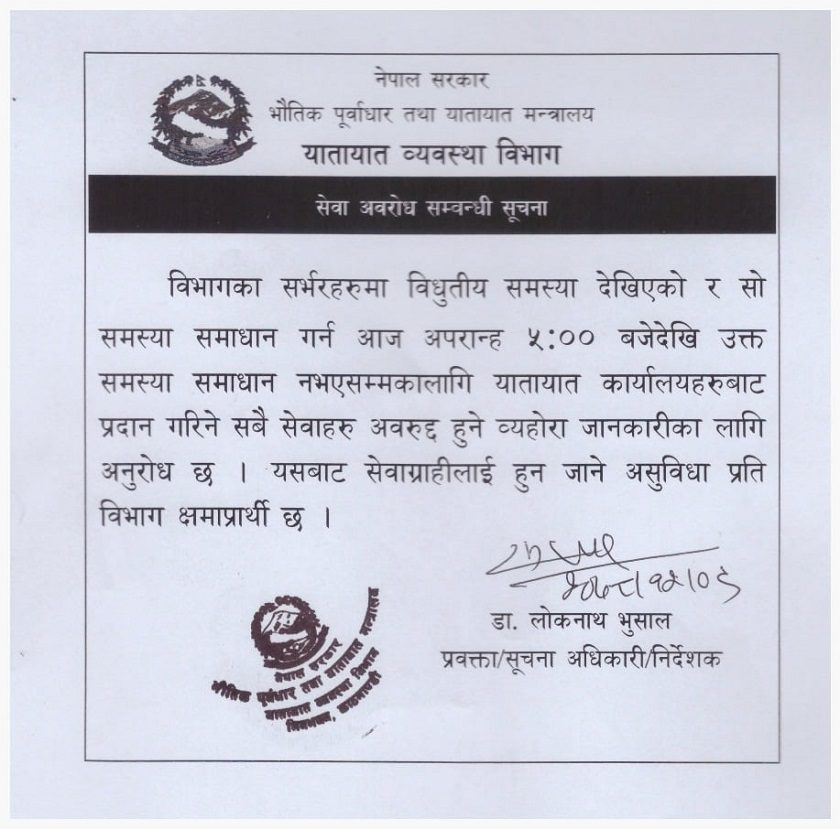विभागले सेवाग्राहीलाई हुन जाने असुविधाप्रति क्षमायाचना गरेको छ । यातायातको सर्भरमा पटक पटक समस्या हुँदै आएकाले विभागले पछिल्लो यो निर्णय गरेको हो ।