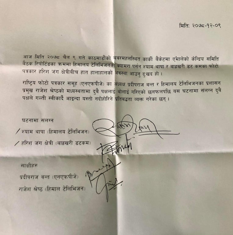 कार्की बैङ्कटमा नेकपा एमालेको केन्द्रीय कमिटी बैठकको रिपोर्टिङ गर्न पुगेका हिमालय टिभीका श्याम थापा र बाह्रखरी डटकमका हरिस जंग क्षेत्रीबीच हात हालाहाल भएको थियो । दुवैलाई बोलाएर गरिएको छलफलमा उनीहरूले आफ्नो गल्ती स्वीकार गर्दै अब आइन्दा यस्तो नगर्ने प्रतिबद्धता जनाएका हुन् ।