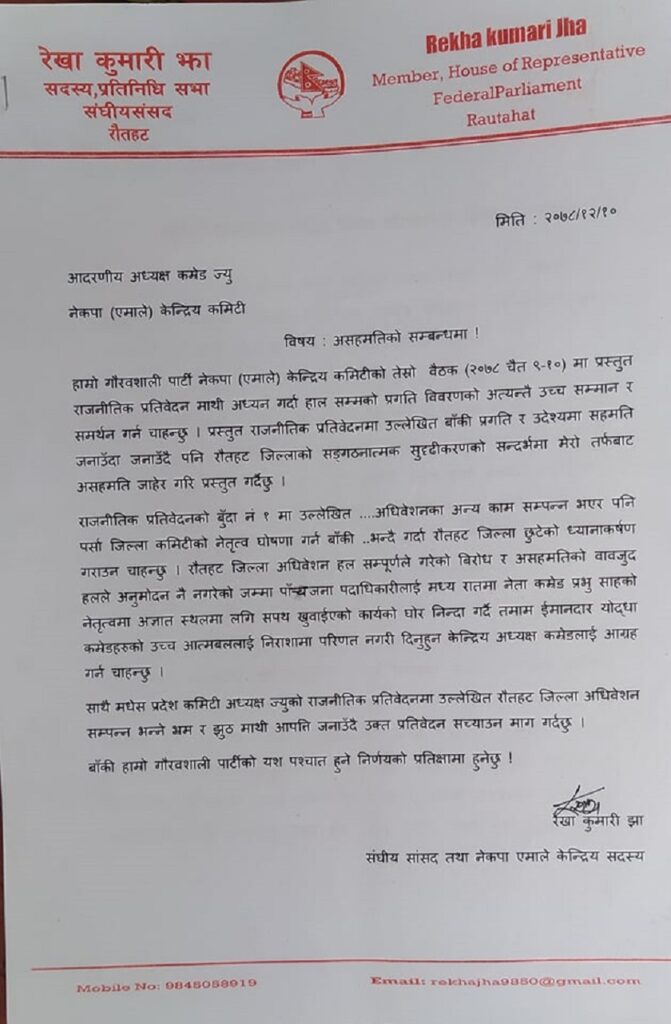रेखाले केन्द्रीय कमिटी बैठकमा दिएको उजुरीमा भनिएका छ– ‘रौतहट जिल्ला अधिवेशन हल सम्पूर्णले गरेको विरोध र असहमतिका बाबजुद हलले अनुमोदन नै नगरेका पाँचजना पदाधिकारीलाई मध्यरातमा नेता प्रभु साहको नेतृत्वमा अज्ञात स्थलमा लगि सपथ खुवाइएको कार्यको घोर निन्दा गर्दै तमाम इमान्दार योद्धा कमरेडहरूको उच्च आत्मबललाई निराशामा परिणत नगरी दिनुहुन केन्द्रीय अध्यक्ष कमरेडलाई आग्रह गर्न चाहान्छु ।’