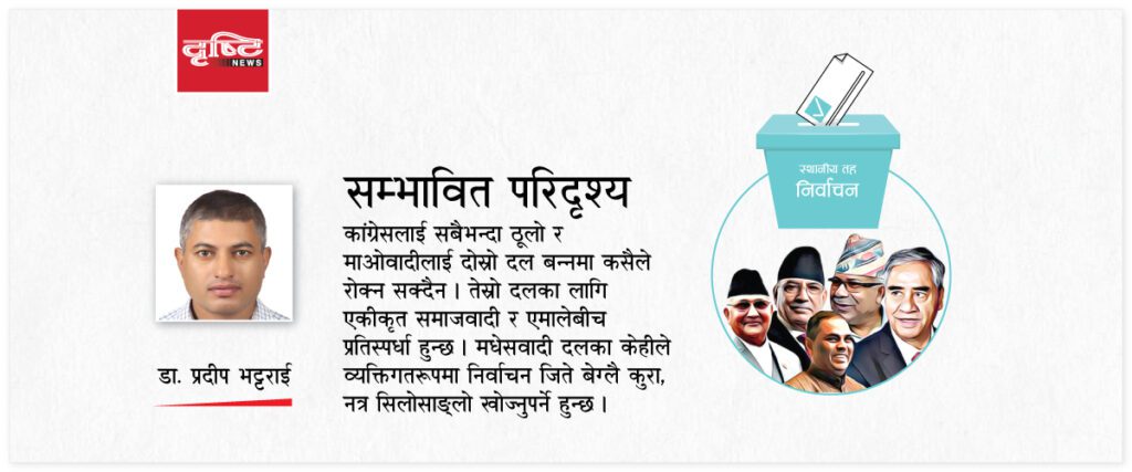 यो परिस्थिति अर्थात् अहिलेको सत्ता गठन्धन नै निर्वाचनी गठबन्धनमा परिणत भएर निर्वाचनमा गयो भने ओलीको एमाले पहिलोबाट तेस्रो दल बन्नका लागि मेहेनत गर्नुपर्ने हुन्छ । कांग्रेसलाई सबैभन्दा ठूलो र माओवादीलाई दोस्रो दल बन्नमा कसैले रोक्न सक्दैन । तेस्रो दलका लागि एकीकृत समाजवादी र एमालेबीच प्रतिस्पर्धा हुन्छ । समाजवादी दल पनि सत्ता गठबन्धनमा भएकाले उसलाई पनि फाइदा हुन्छ, अन्य मधेसवादी दल थप चोइटिएकाले तराई–मधेसको चरित्रअनुसार व्यक्तिगतरूपमा केहीले निर्वाचन जिते भने बेग्लै कुरा, नत्र सिलोसाङ्लो खोज्नुपर्ने हुन्छ ।