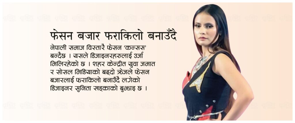 केही समयअघि काठमाडौंमा एउटै स्टेजमा १४४ जना फेसन डिजाइनर प्रतिस्पर्धामा उत्रिएका थिए । कार्यक्रम थियो– ड्रेस टु इम्प्रेस–४ । आईआईएफटी (स्कुल अफ फेसन)ले आयोजना गरेको उक्त प्रतिस्पर्धामा चार जना उत्कृष्ट ठहरिए, त्यसमध्येकी एक हुन्, सुनिता खड्का । प्रतिस्पर्धीलाई ‘लक्की-ड्र’मार्फत थिम रोज्न लगाइएको थियो, जसमा सुनितालाई परेको थियो, ‘डेनिम थिम’ । यो थिम ८० को दशकतिर चलनमा आएको हो, जसको विशेषता महिलालाई केहीहद भएपनि बलात्कारबाट सुरक्षित गराउनु हो । त्यही थिममा उत्कृष्ट ठहरिएपछि सुनिताले सुनाइन्, ‘उत्कृष्ट फेसन डिजाइनर बन्ने मेरो लक्ष्य र उद्देश्य हो ।’ सहर केन्द्रित युवा जमात र सोसल मिडियाको बढ्दो क्रेजले फेसन बजारलाई फराकिलो बनाउँदै लगेको डिजाइनर सुनिताको बुझाइ छ । उनै सुनितासँग एमपी सुब्बाको जम्काभेट :
