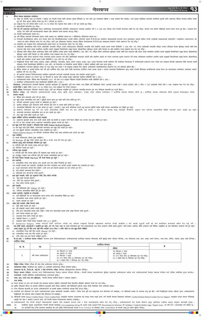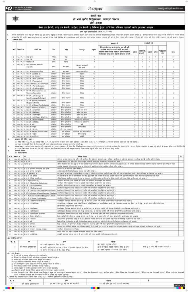 सैनिक उपचारिका (उपसेनानी) १८ जना र कम्प्युटर प्राविधिक (उपसेनानी) १६ जनालगायत विभिन्न २९ पदका लागि १९४ जना प्राविधिक अधिकृतका लागि विज्ञापन आह्वान गरिएको छ । यी सबै पदका लागि अनलाइनबाट फाराम भर्न सकिनेछ । आगामी वैशाख १३ गतेसम्म दर्खास्त दिन सकिनेछ ।