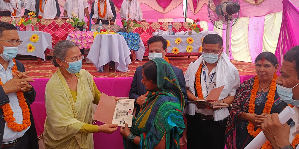कपिलवस्तुको सुद्धोधन नगरपालिका वडा नं. ६ को गाउँब्लकमा रहेका ८२ घरपरिवारलाई आज जग्गाधनी दर्ता प्रमाण पूूर्जा (लालपूर्जा) वितरण गर्दै मन्त्री श्रेष्ठले गाउँब्लकमा रहेका सबै नागरिकले छिटो लालपूर्जा प्राप्त गरुन भनेर विशेष अभियान मार्फत कामलाई तिब्र पारिएको बताइन् ।