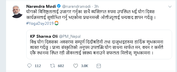 अन्तराष्ट्रिय योगा दिवसको अवसरमा प्रधानमन्त्री ओलीले गरेको ट्विटमा रिप्लाई गर्दै भारतीय प्रधानमन्त्री मोदीले नेपालीमै लेखेका छन् “योगको विशिष्टतालाई उजागर गर्नुका साथै व्यक्तिगत रुपमा उपस्थित भई योग दिवस कार्यक्रमलाई सुशोभित गर्नु भएकोमा प्रधानमन्त्री ओलीज्यूलाई धन्यवाद ज्ञापन गर्दछु ।“