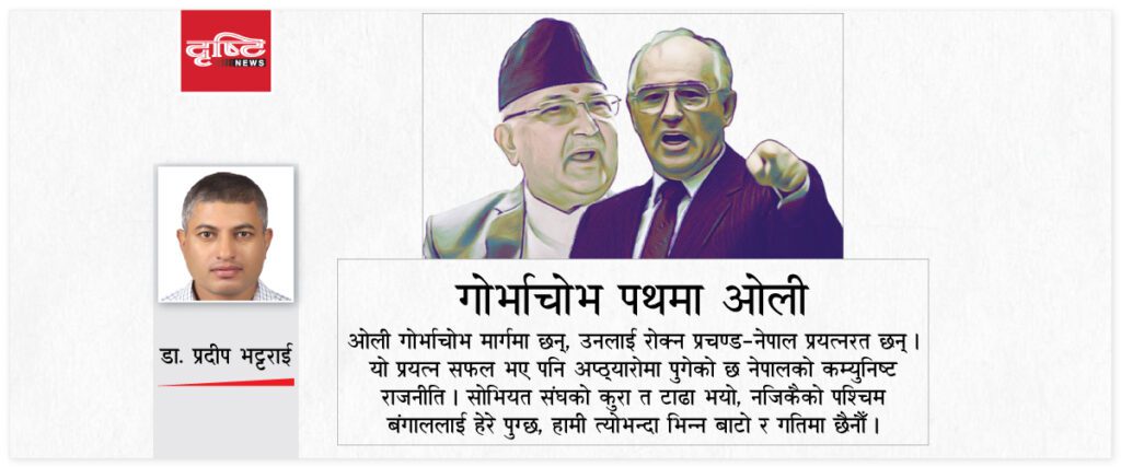 नेपालका कम्युनिष्ट नेता, कार्यकर्ता र पार्टीहरू स्खलित भएको देख्दा कम्युनिष्टको दिन आओस् भनेर जिन्दगी बिताउने मानिसहरू निराश हुनुपर्ने स्थिति देखिए पनि एउटा कुरा भने निश्चित छ, त्यो के भने नेपालमा कम्युनिष्ट पार्टी सकिए पनि कम्युनिष्ट विचारधारा कहिलै सकिँदैन । कारण, त्यो विचारधारालाई माया गर्ने जनता नसकिनु हो । यसमा उनीहरूको बाध्यता पनि छ । किनकि, जबसम्म गरिबी हुन्छ, अभाव हुन्छ, अन्याय हुन्छ, अत्याचार हुन्छ, त्यहाँ प्रतिरोधका लागि कम्युनिष्ट बाँकी रहन्छ, सकिने भनेको भ्रष्ट कम्युनिष्ट नेता, कार्यकर्ता र तिनीहरूका पार्टी मात्र हुन् ।अहिले ओली गोर्भाचोभ मार्गमा छन्, उनलाई रोक्न प्रचण्ड–नेपाल प्रयत्नरत छन् । यो प्रयत्न सफल भए पनि अप्ठ्यारोमा पुगेको छ नेपालको कम्युनिष्ट राजनीति । सोभियत संघको कुरा त टाढा भयो, नजिकैको पश्चिम बंगाललाई हेरे पुग्छ, हामी त्योभन्दा भिन्न बाटो र गतिमा छैनौँ ।
